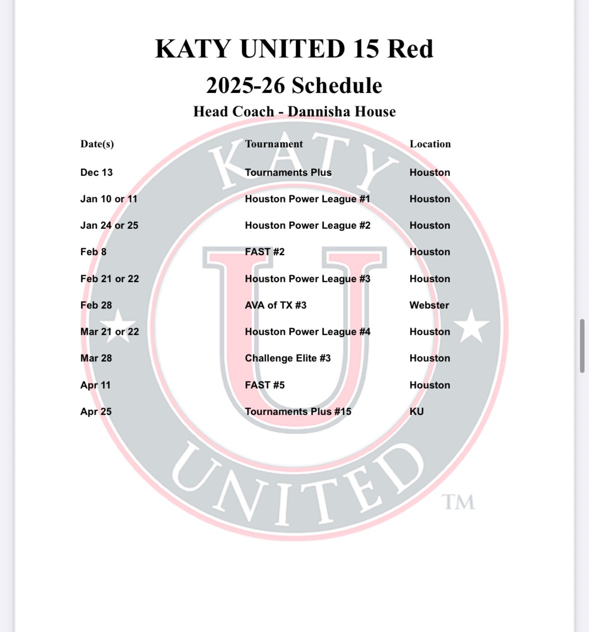 practice 5:30 PM (2h) Katy United Court 1 12 Adidas 12 Molten 13 Adidas 14 Molten 14 Adidas 14 Fathom - Sarah 15 Navy