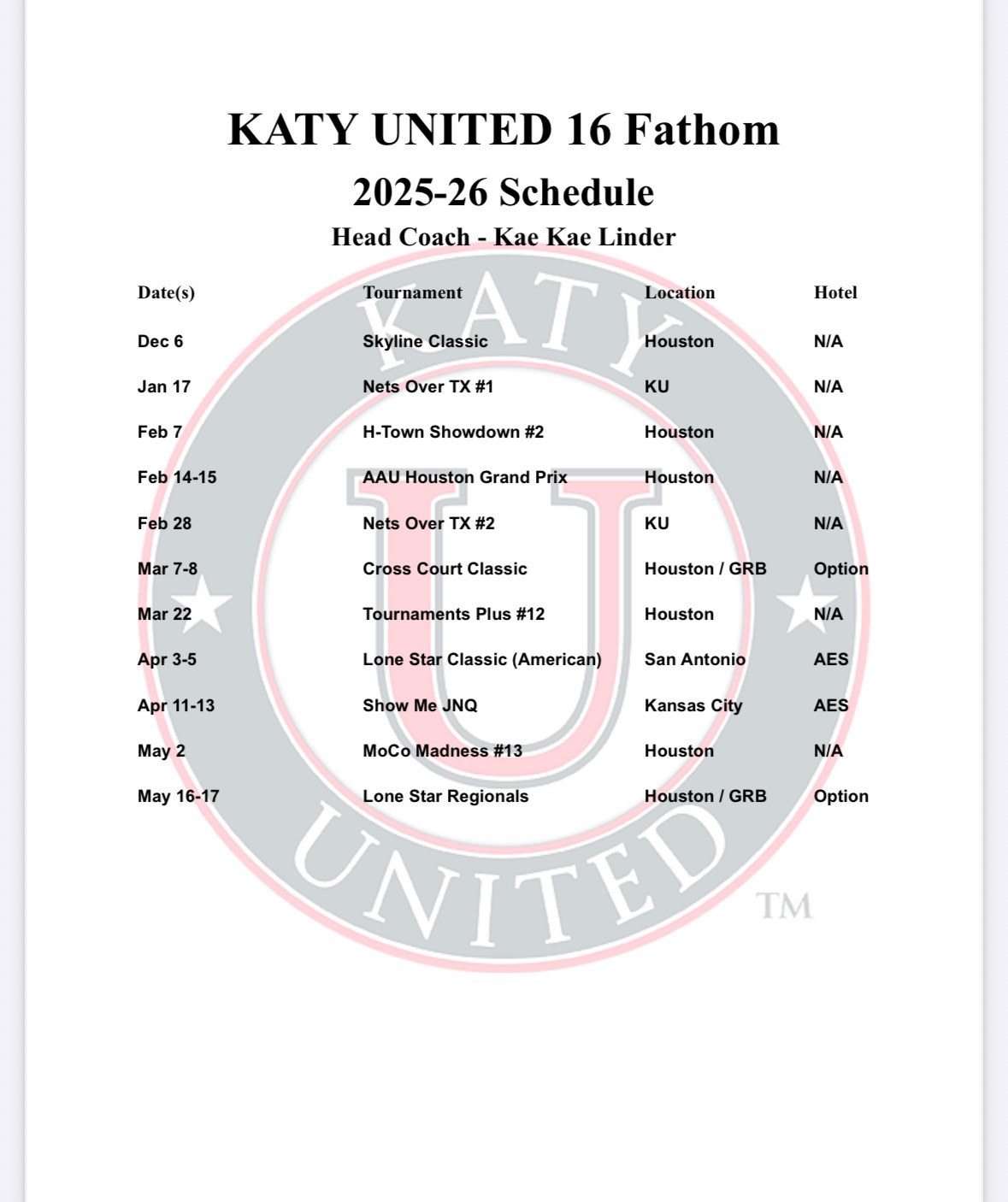 practice 7:30 PM (2h) Katy United Court 1 15 Fathom 15 White 15 Grey 16 Navy 16 Red 16 White