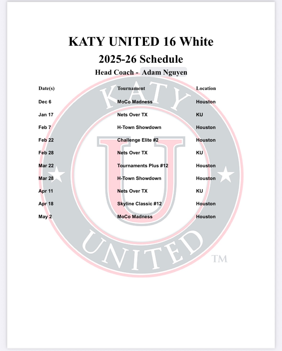 practice 7:30 PM (2h) Katy United Court 1 15 Fathom 15 White 15 Grey 16 Fathom 16 Navy 16 Red