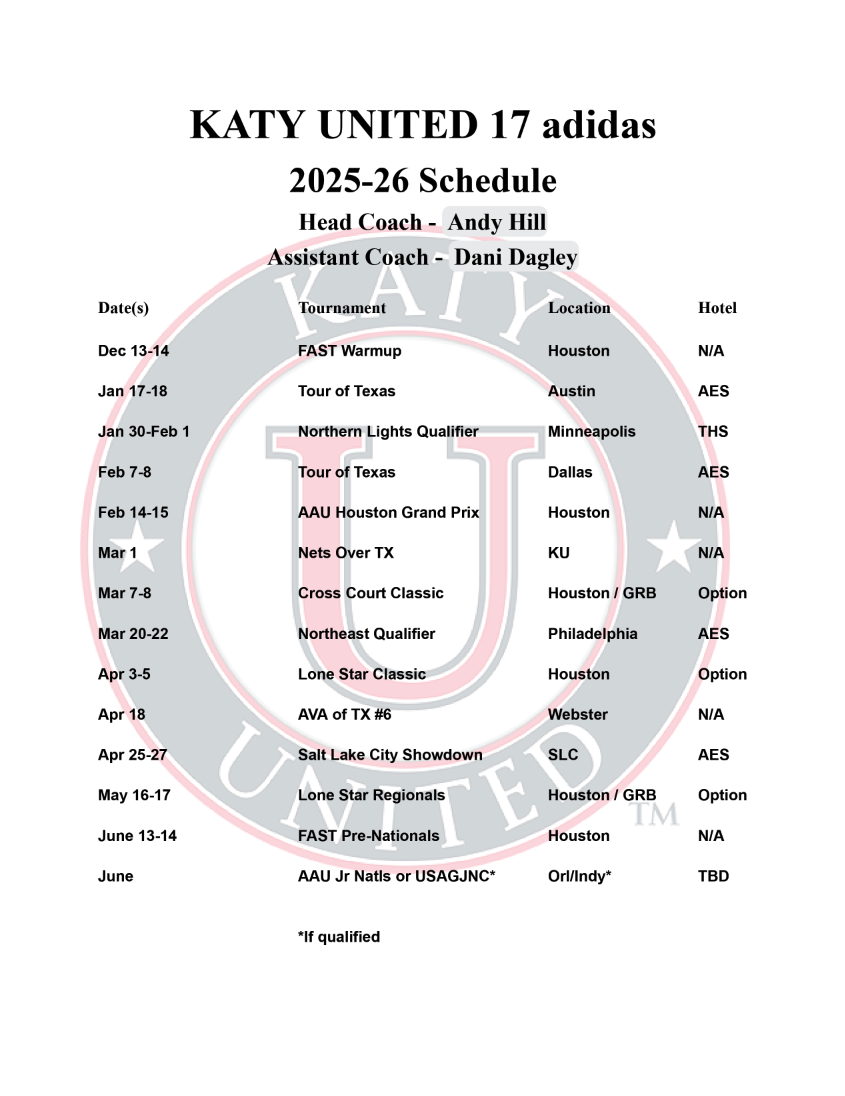 practice 7:30 PM (2h) Katy United Court 1 15 Adidas 15 Molten 16 Adidas 16 Molten 17 Molten 18 Adidas