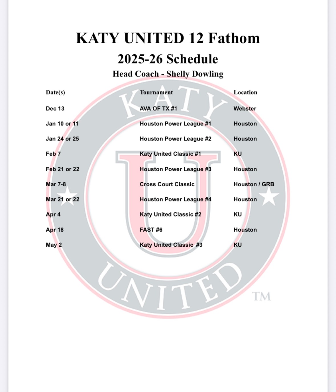 practice 5:30 PM (2h) Katy United Court 1 13 Fathom 13 Navy 14 Fathom - Jorge 13 Molten 14 Navy 14 Red 14 White